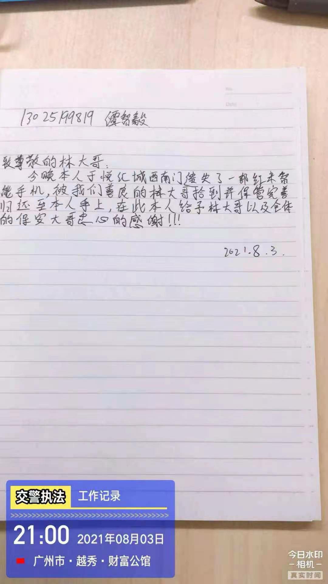 2021年8月3日,金年会官网-金年会(中国)一站式服务官网驻西村悦汇城保安员林伟强像往常一样准备交接岗,当走至负一西南门门口的时候发现地上有一部黑色智能手机,林伟强在现场等待失主并上报了当班值班经理,不一会儿失主打电话过来,核实了失主身份后将失物归还。失主十分感动,并现场手写感谢信一封以表谢意。